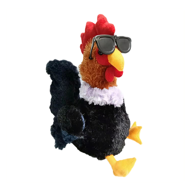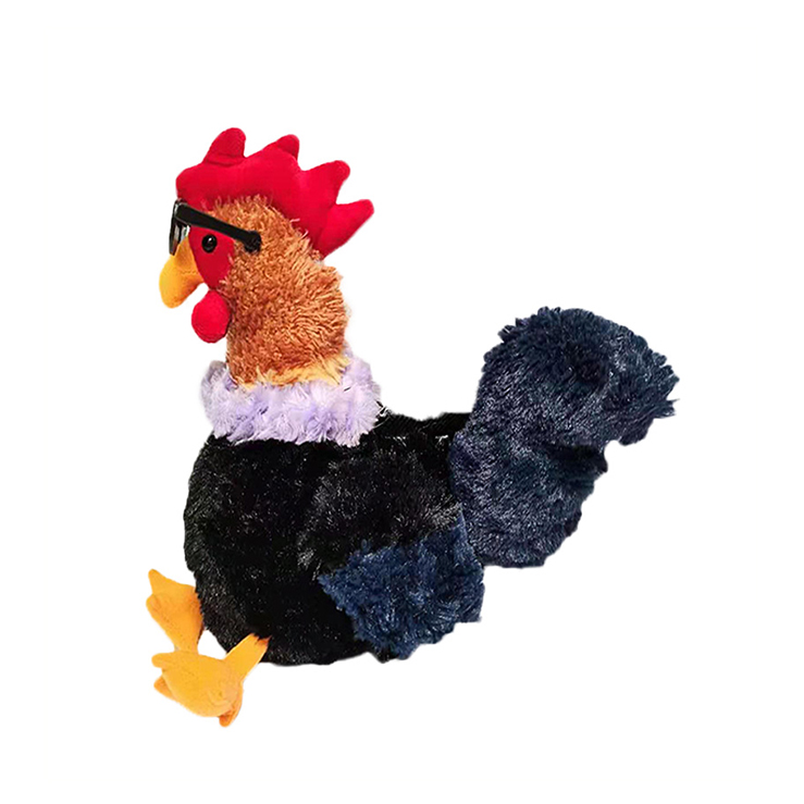 The rooster was made with soft polyester fur and soft boa. It sports a vibrant red comb on its , a classic feature of a rooster. Perched on its eyes is a pair of black sunglasses, which gives it a cool and trendy vibe, making it stand out as a playful and fashionable item.